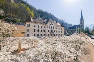 Regierungsgebäude in Vaduz mit weissen Blumen im Vordergrund bei strahlendem Sonnenschein