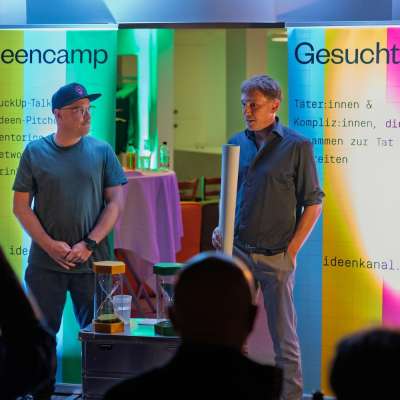 Interessierte nutzen das Ideencamp als Treffpunkt für spontane Gespräche und erleben inspirierende Begegnungen.