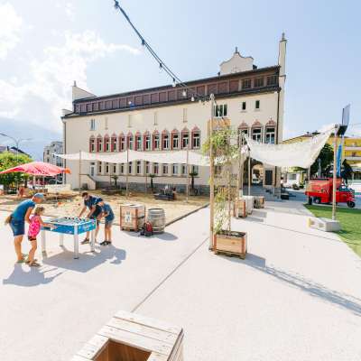 Der Aussenplatz bietet Platz für rund 450 Personen und eignet sich gut für Konzerte und Anlässe. Der Rathausplatz ist über den Sommer mit einem 400 m2 grossen Zelt überdacht und die Konzertmuschel im vorderen Teil des Platzes kann mit einer mobilen Bühne erweitert werden.