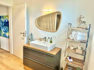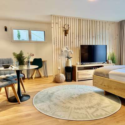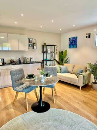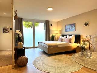 Das Alpenglanz Deluxe Studio in Schaan bietet auf 43 m² modernen Wohnkomfort für ein bis zwei Personen. Das Studio mit separatem Eingang überzeugt durch stilvolles Design, liebevolle Details und eine ruhige Lage am Fusse der Drei-Schwestern-Berge.