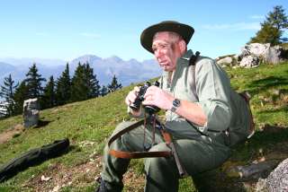 Ein Jäger mit Fernglas sitzt auf einer Wiese vor alpiner Bergkulisse.