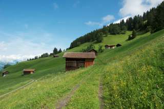 Alpweiden mit verstreuten Holzstadeln an einem grünen Hang bei Masescha.