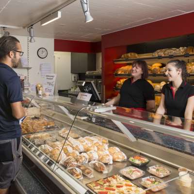 Das Angebot ist klein, aber fein und umfasst alle Produkte aus Bäckerei, Konditorei und Confiserie. Ideal für Kaffee und Gipfeli nach dem Tageseinkauf oder für ein heisses Fleischkäsbrötli zum Znüni oder ein Stück Kuchen zum Zvieri.
