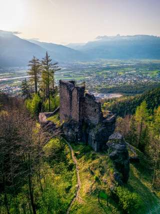 Die Burg Schalun, auch Wildschloss genannt, ist von Vaduz aus in rund einer Stunde auf einem stetig ansteigenden Fuhrweg im Wald zu erreichen. Entlang des Weges kommt man auch an der neuen Aussichtsplattform vorbei. Bei der Burg geniesst man eine herrliche Aussicht auf das Rheintal.