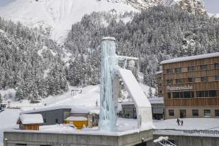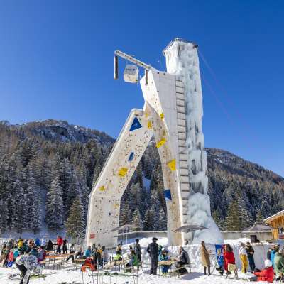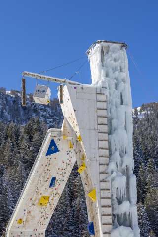 Liechtensteiner Alpenverein erschaffe in Malbun bei eisigen Temperaturen eine faszinierende Eiswelt. Der Turm ist bis zu 20 m hoch und regelmässig finden Events statt.