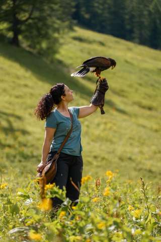 Erlebe die Faszination der Falknerei hautnah! In der Falknerei Galina in Malbun kannst du mit einem Harris-Hawk auf Tour gehen und selbst zum Falkner werden.