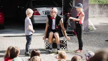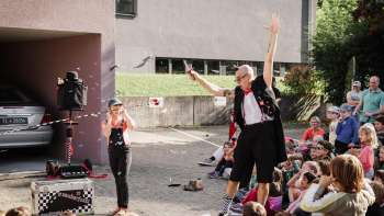 Neben Kinderateliers gibt es humorvolles und überraschendes Zirkustheater von der Compagnie Tarkabarka. Ganz ohne Worte begeistern sie mit ausdrucksstarkem Theater, feiner, Clownerie, flotter Akrobatik und poetischen Momenten. Wer kennt ihn nicht: Magic Zauberfuzzi Albi? Er ist besonders, besonders liebenswert, besonders zauberhaft und besonders tollpatschig und zaubert eine schräge Mischung aus Zauberei & Comedy auf den TAK-Vorplatz. Und auch eine fantastische Reise in einem Wohnwagen können die Besucher:innen in «Avion Papier» erleben.