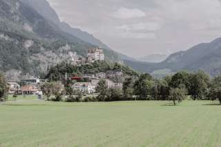Majestätische Aussicht auf Burg Gutenberg in Balzers, umgeben von grünen Feldern und den beeindruckenden Alpen.