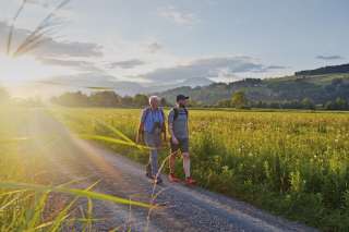 Wanderung mit Marco Büchel auf dem Liechtenstein-Weg mit Blick auf idyllische Wiesenlandschaft.