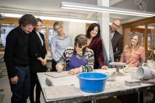 Eine Gruppe interessierter Besucher beobachtet eine Töpferin beim Modellieren – Kreativerlebnis in gemütlicher Atmosphäre in der Keramikwerkstatt Schädler in Nendeln.